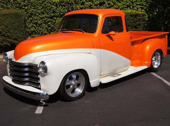 We called this '54 truck the 50/50 bar after the orange and cream treat from the 50's. After going through the 383 engine, we started on a ton of upgrades including a custom radiator, 4 wheel disc brakes, new front and rear suspension, fuel tank and pump, headers, transmission pan and more. We fabricated a new transmission crossmember, gave it a new custom cooling system, core support, hoses and lines, and new power brake system. To finish it off we made a beautiful oak panel bed and gave the truck a performance tune on the dyno.
